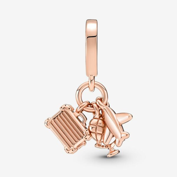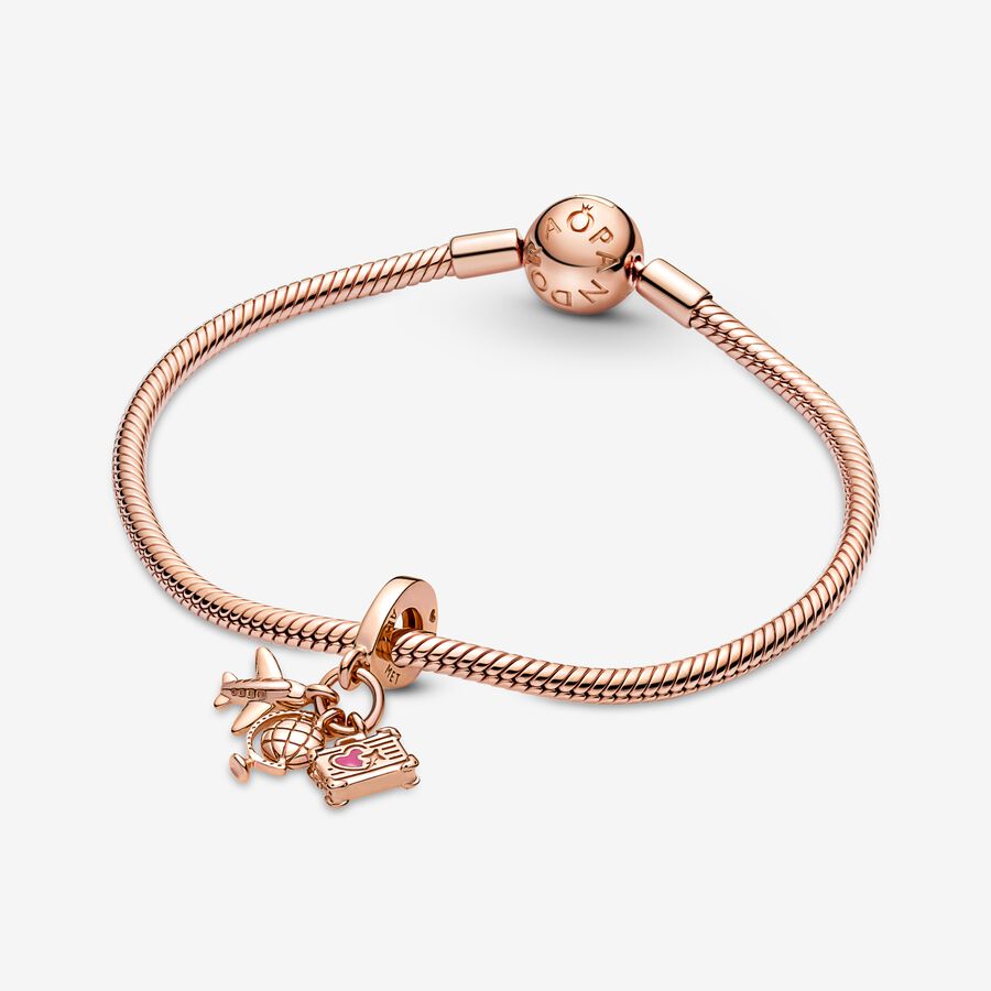 Fly away on a dream adventure with this 14k rose-gold plated travel charm. This triple dangle charm features three symbols of travel: an airplane, a globe and a suitcase with lifelike corner details and a tiny pink enamel heart. Style it on your Pandora Moments pieces to carry your travel memories with you and look forward to new adventures.