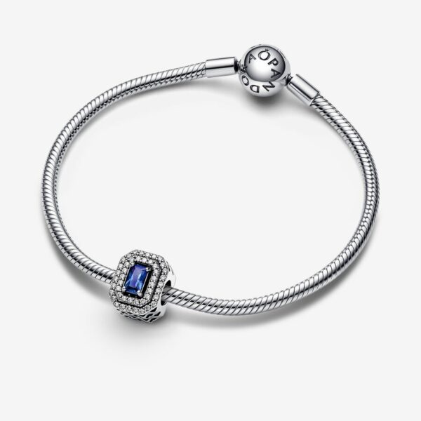 Bring a sophisticated touch of color to your jewelry with the Blue Sparkling Leveled Rectangular Charm. Crafted from sterling silver, each side of the charm features a princess blue, rectangular, radiant-cut, man-made crystal at the center, outlined by two rows of clear cubic zirconia pavé. A cut-out heart pattern features on the sides. Style this piece on your go-to Pandora Moments bracelet to make a sparkling statement.