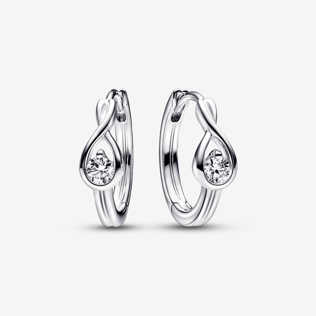 A pair of sterling silver hoop earrings each hand-set with a 0.1 carat lab-created diamond. As a pair this equates to 0.20 carat total weight. A symbol of empowerment, evolution and possibility. Each earring showcases a fiery round brilliant lab-created diamond in a modern infinity setting that flows seamlessly around the stone and continues into an elegant hoop. For paired earrings, an accompanying certificate warrants the size and quality of each individual stone.