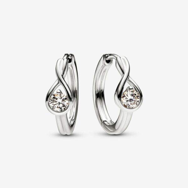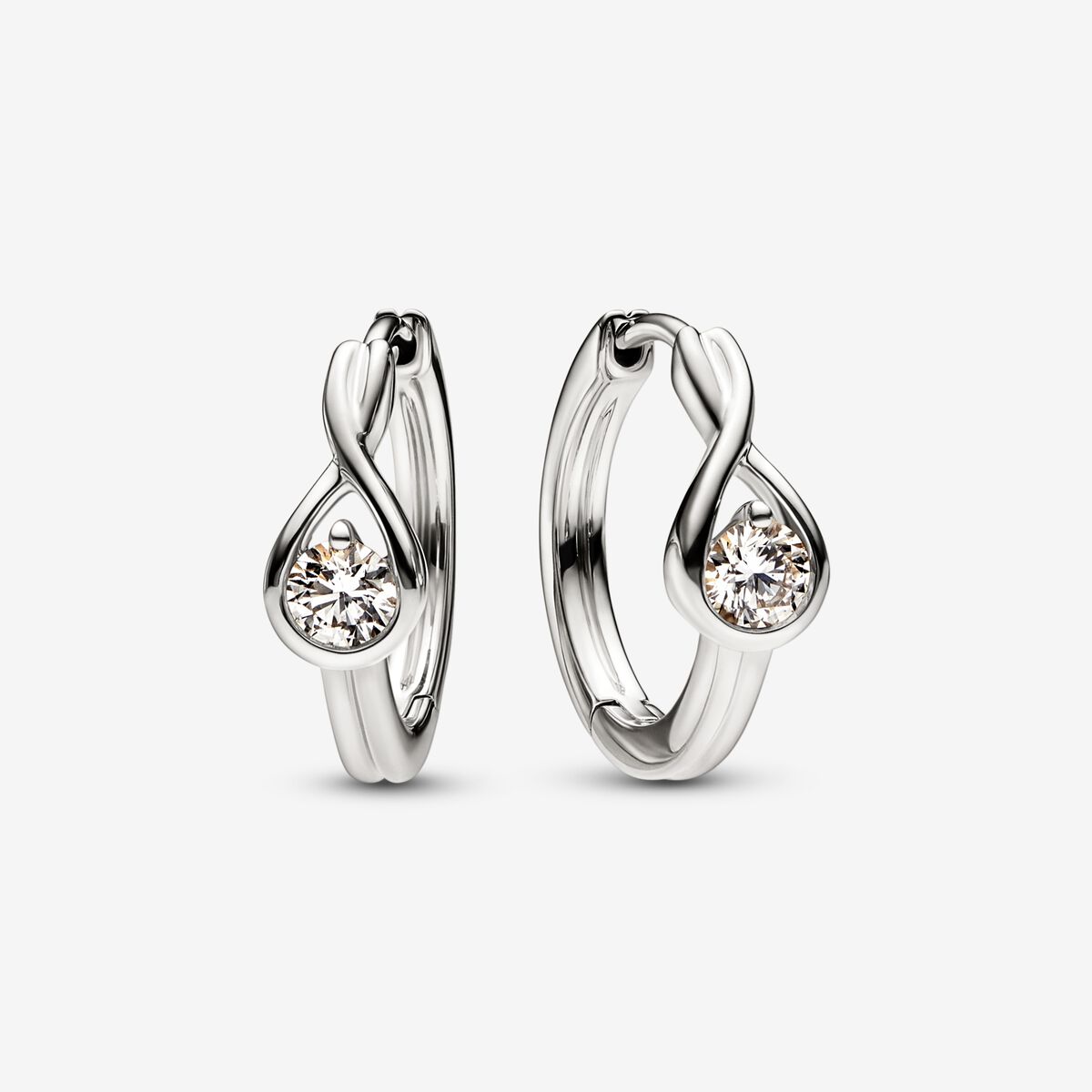 A pair of solid 14k white gold hoop earrings each hand-set with a 0.25 carat lab-created diamond. As a pair this equates to 0.50 carat total weight. A symbol of empowerment, evolution and possibility. Each earring showcases a fiery round brilliant lab-created diamond in a modern infinity setting that flows seamlessly around the stone and continues into an elegant hoop. For paired earrings, an accompanying certificate warrants the size and quality of each individual stone.
