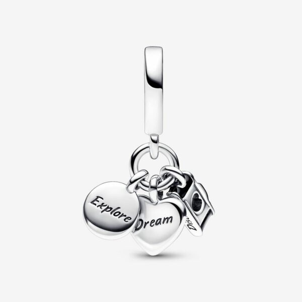 One for the dreamers and explorers. Wear the Camera, Heart & Compass Triple Dangle Charm to carry your favorite travel memories on your jewelry. This sterling silver triple dangle features a camera with a sparkling stone as the lens, a heart-shaped map of the world with blue and green gradient enamel and a compass with a fixed orienteering arrow. “Discover”, “Dream” and “Explore” are engraved on the backs of the dangles. Style it together with your favorite charms from your travels as a reminder to always keep exploring.