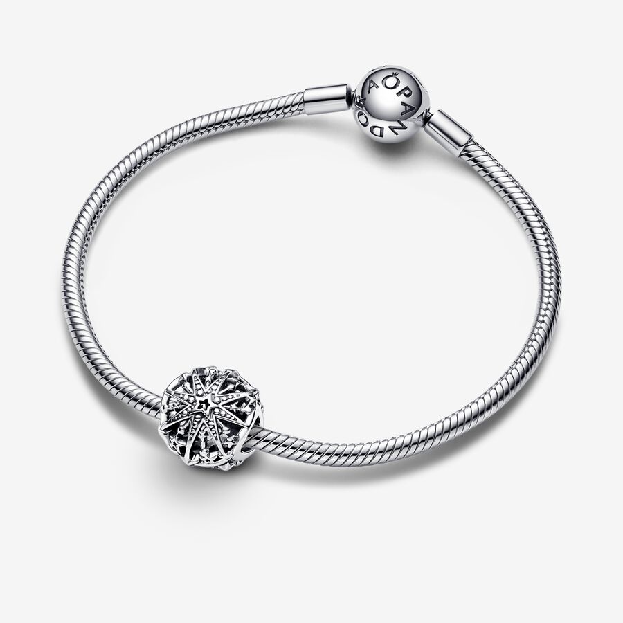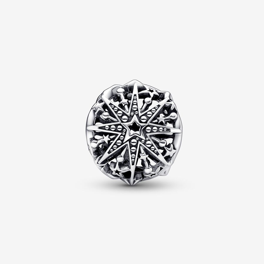 Catch a falling snowflake and wear it on your jewelry. This detailed sterling silver charm features a cut-out five-point star motif on both sides, within a larger eight-point star with intricate openwork details and micro-beading, creating a snowflake-like effect. Small faceted and cut-out stars surround the central star, creating a magical starburst look to bring a celestial touch to your holiday styling.
