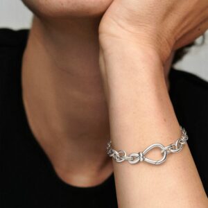 It’s double the love with Pandora’s unique interpretation of the infinity symbol. The iconic knot wraps around the asymmetrically-set center to signify the strength of the connection. This chunky sterling silver infinity knot bracelet is the perfect representation of an unbreakable bond and a classic addition to your bracelet collection. The infinity clasp opens and can be styled with up to two Pandora Moments dangle charms or pendants.