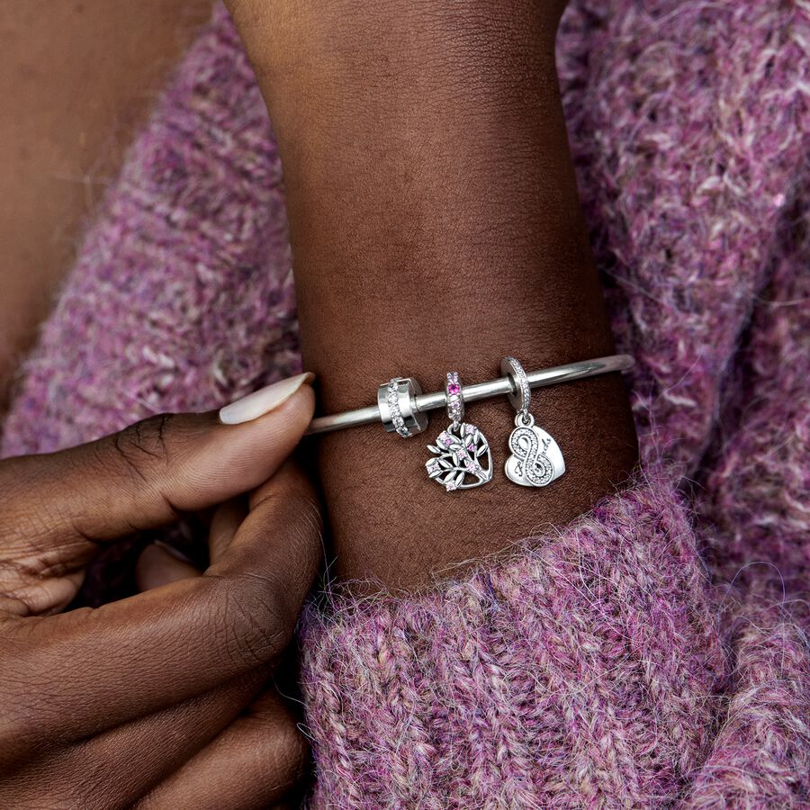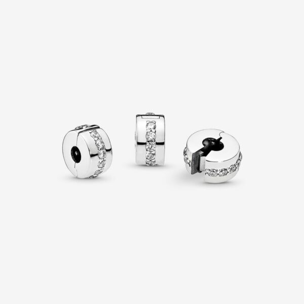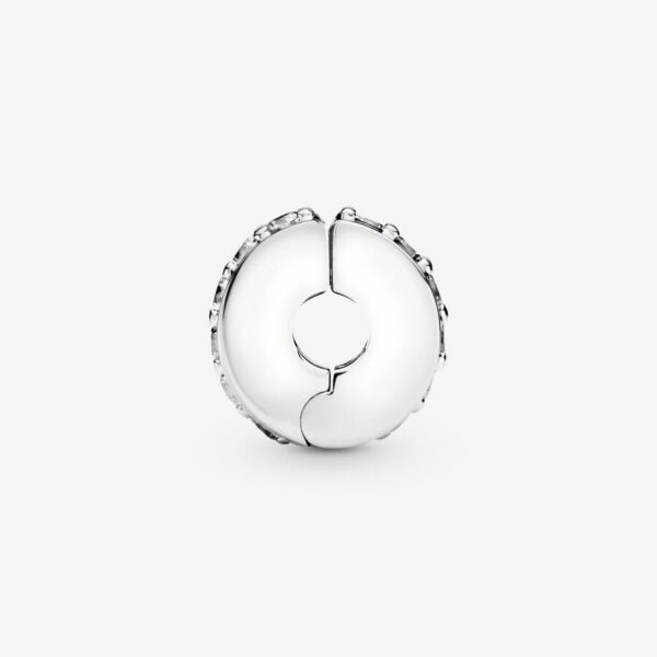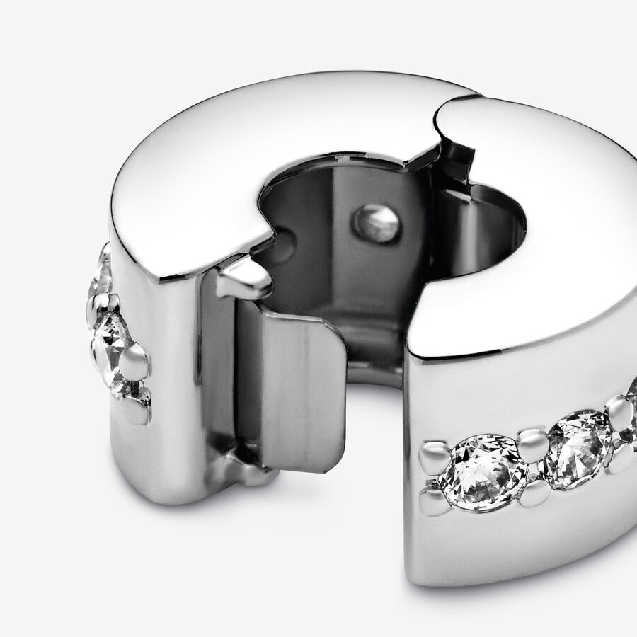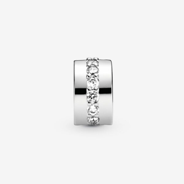 Pandora Moments clip charms help you to evenly space out your charms, bringing both balance and beauty to bracelets. This one is made from sterling silver, accented with a line of cubic zirconia that runs around its middle. Add a single piece to a styling or add one to each end of your bracelet as subtle accents. This clip charm features no silicone grip, so it will slide if not styled onto threads (two raised charm dividers).