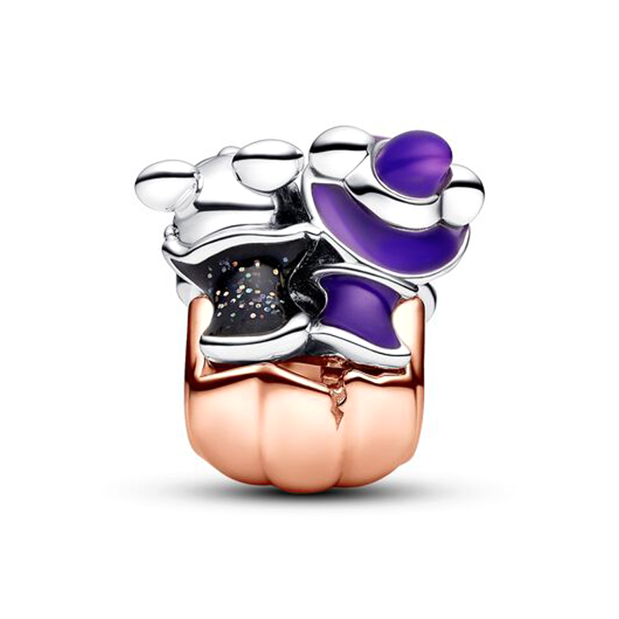 Have a charmed Halloween with the Disney Mickey Mouse & Minnie Mouse Halloween Pumpkin Charm. The 14k rose gold-plated pumpkin design features cut-out and grooved details that create realistic dimension. A sterling silver Mickey and Minnie Mouse pop out of the pumpkin. Mickey wears a Halloween costume with glittering enamel, while Minnie wears a costume with glow-in-the-dark details. A festive addition to any Disney or Halloween lover’s collection, this playful piece will add some spooky fun to your styling.