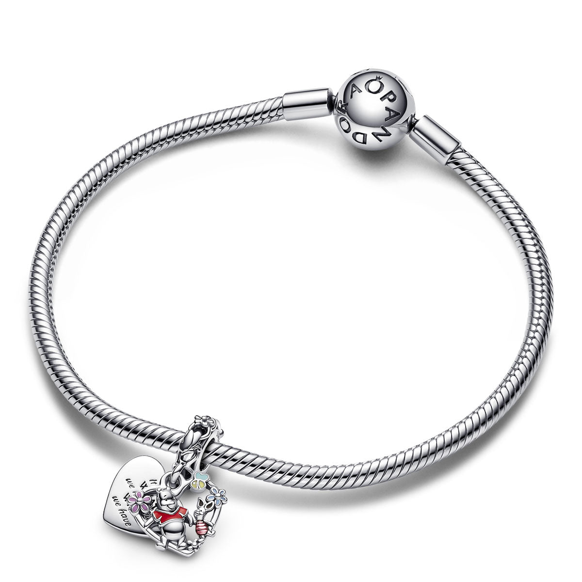 Life is better with friends by your side. Reignite your favorite memories with the sterling silver Disney’s Winnie the Pooh & Piglet Double Dangle Charm featuring the best friends from the Hundred Acre Wood. The two friends walk hand-in-hand through an idyllic landscape with openwork enamel-detailed bees and flowers in a heart-shaped frame. Another heart-shaped disc forms the background and is engraved with the message, “It’s not WHAT we have but WHO we have”. Wear it to remind you of someone special or gift it as a joyful symbol of love and friendship.