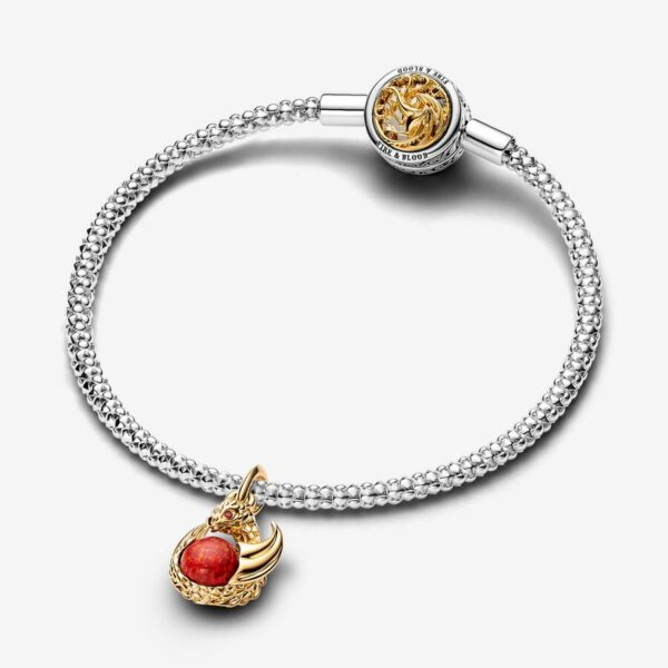 Collect your way through Westeros with the Game of Thrones Dragon Fire Dangle Charm. Here, a Game of Thrones dragon in 14k gold-plated metal wraps its body around a red lab-created opal. Intricately detailed, the dragon has two red lab-created crystals for eyes and textured lines that imitate scales and wings. In the world of Game of Thrones, dragons possess great power, as do the humans who ride them. Carry this dragon charm as a token of your own power.