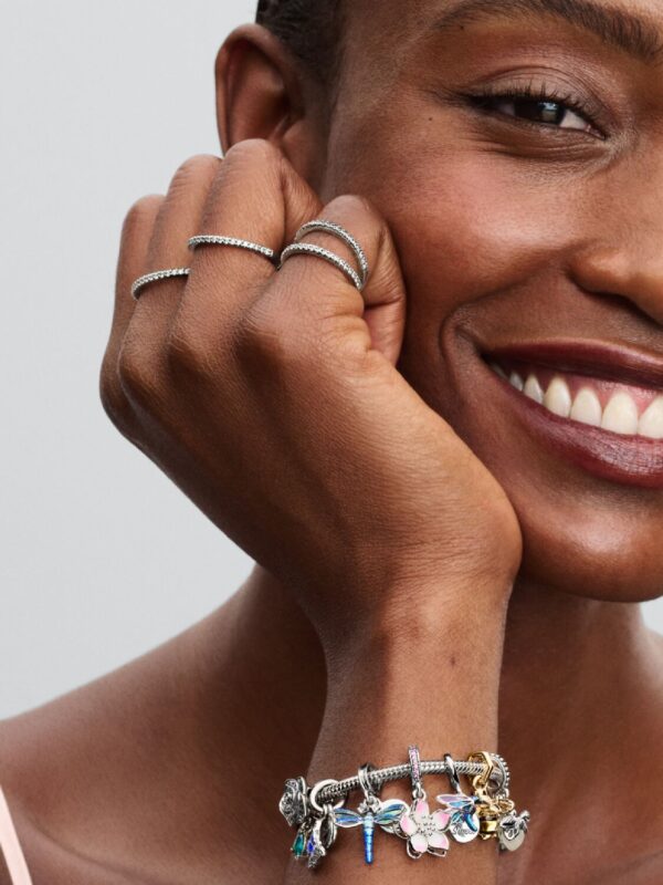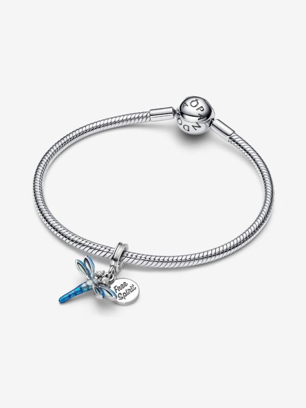For the free spirits. Inspired by a dragonfly dancing in the wind, this sterling silver dragonfly charm symbolises embracing change and living in the moment. Transparent enamel brings lightness to the dragonfly’s wings, and holographic glitter enamel shimmers on its body. Sparkling stones form the dragonfly’s eyes and a round disc behind it bears the message “Free Spirit”.