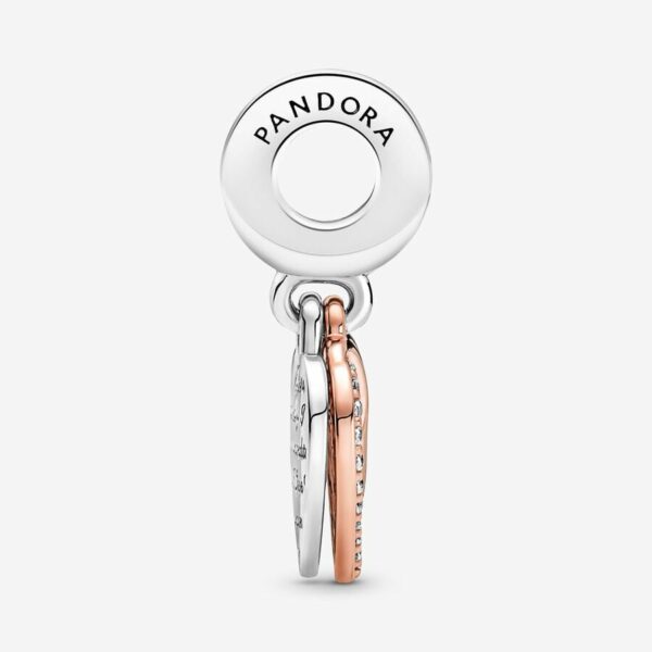 This Entwined Hearts Double Dangle Charm is the perfect piece to give your bracelet a loving touch. Engraved with the words “I Love You Unconditionally”, this Pandora Moments charm is hand-finished in sterling silver and 14k rose gold plating set with clear cubic zirconia, with two hearts that come together to represent eternal love.
