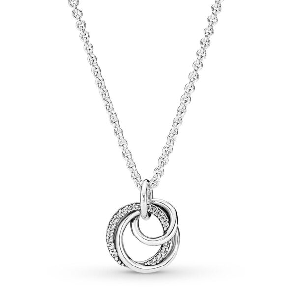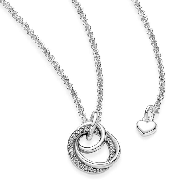 A symbol of everlasting ties, the Family Always Encircled Pendant Necklace features three entwined circles in the pendant – two polished sterling silver and one sparkling cubic zirconia pavé. The closure features a small heart-shaped disc with the Pandora Crown O monogram on one side. The chain length is adjustable, making this a versatile finishing touch to your outfit.