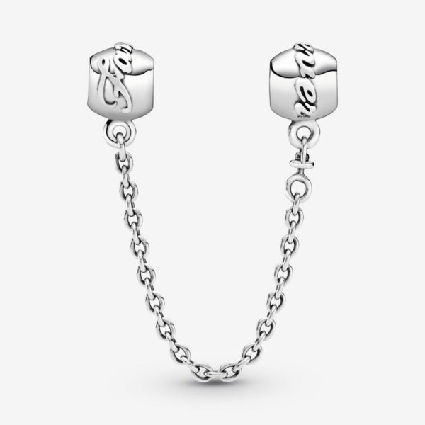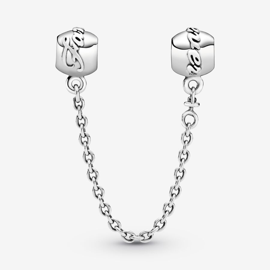 Keep charms in check while showing the importance of family with our safety chain for Pandora Moments bracelets. Cast from sterling silver, the charms are detailed with a swirling script that reads “Family” and “Forever.” The safety chain charm is fitted with swivel ends to prevent it from tangling. Thread one side onto your bracelet before adding charms, connecting the unattached side of the safety chain once your charms are in place.