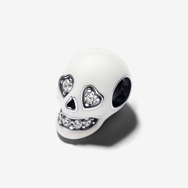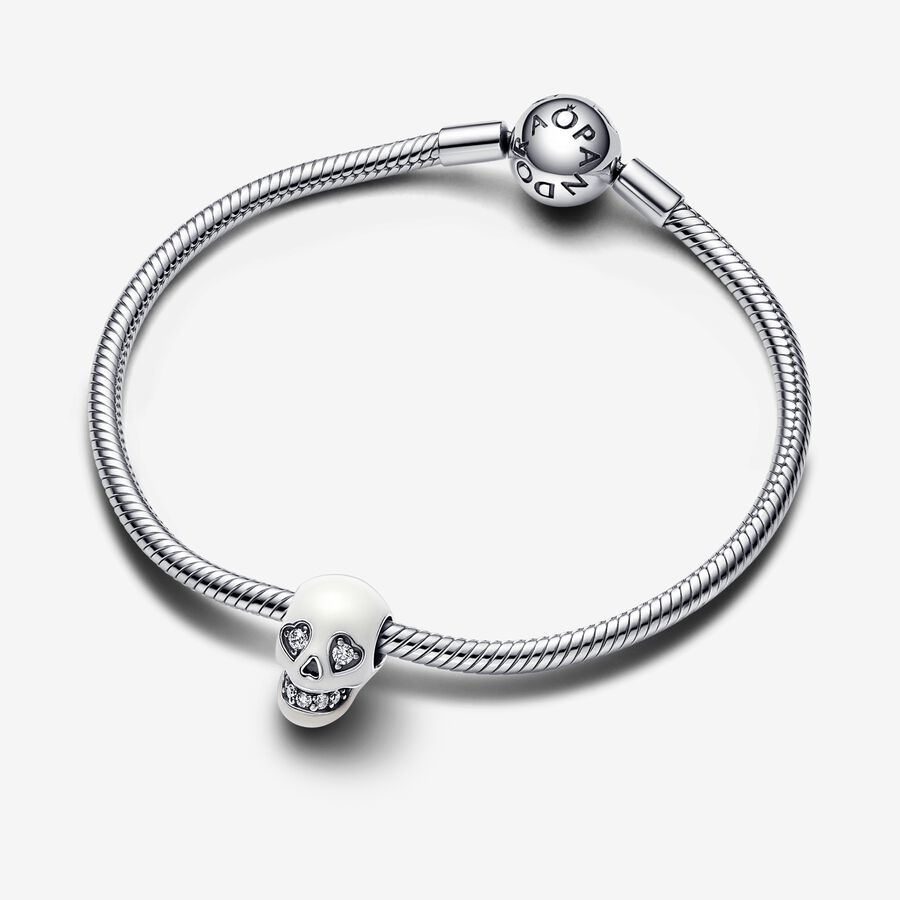 Add some edge to your look when you wear the Glow-in-the-dark Sparkling Skull Charm. This sterling silver charm features a skull covered in glow-in-the-dark enamel with a mouth and heart-shaped eyes sparkling with clear cubic zirconia stones. Cut-out details adorn the sides of the mouth, the nose and the bottom of the skull. Pay homage to the mystery of the afterlife and add an irreverent – not to mention glowing – touch to your style with this skull pendant.