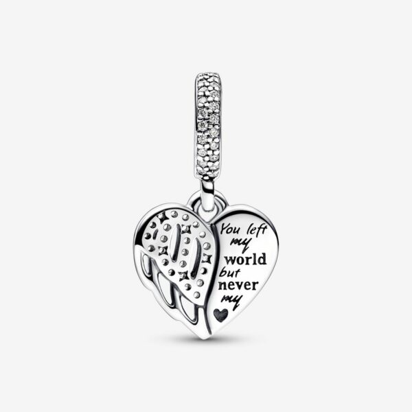 This special charm commemorates a love that is eternal, even when our dear ones are no longer with us. The Heart & Angel Dangle Charm is crafted from sterling silver and features a heart shape with a cut-out angel wing motif on one half of the heart, with the upper part of the wing slightly raised and decorated with pavé. The other half of the heart bears the engraved message “You left my world but never my ❤”. The bail features two rows of pavé on its outer side. A meaningful piece to wear as a reminder of the ones you’ll always carry in your heart.