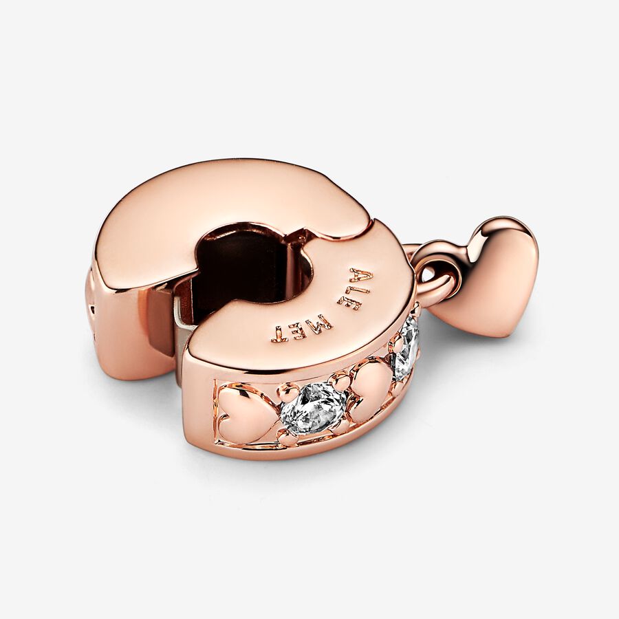 An elegant way to protect your favorite charms and keep them safe, this clip charm is hand-finished with 14k rose gold plating and features raised hearts with sparkling cubic zirconia for a more elevated look. Style yours with more rose gold pieces or mix your metal finishes for a more individual look. Please note: this clip charm features a silicone grip and does not fit over threads (the two raised charm dividers.)