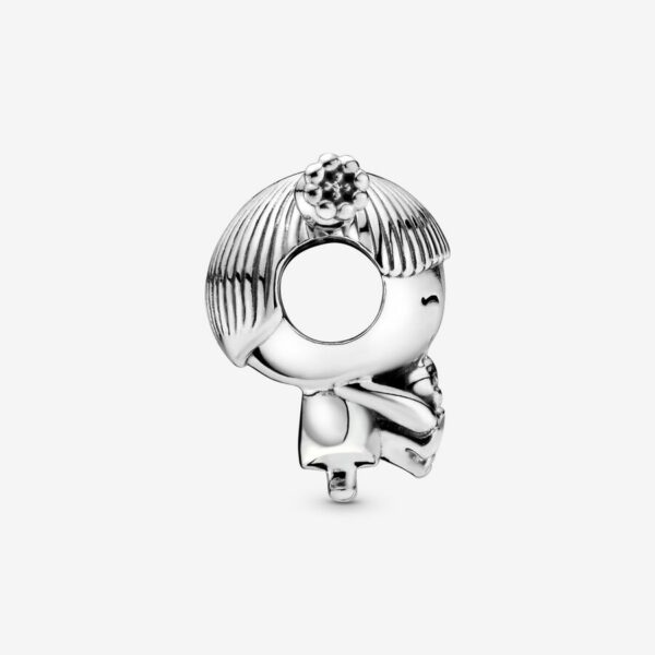 Add a reminder of your little sister, niece or cousin with this charm. The charm is detailed with bouncing pigtails and a friendly smile. The cute girl holds a teddy bear in her arms, who in turn holds a pink enamel heart. Style her together with other family charms on your favourite Pandora Moments bracelet or bangle or as a pendant on a necklace.