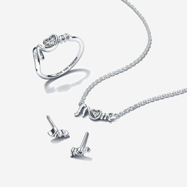 Show mom your love with the perfect necklace, earring and ring set that features “Mom” and “Love”.