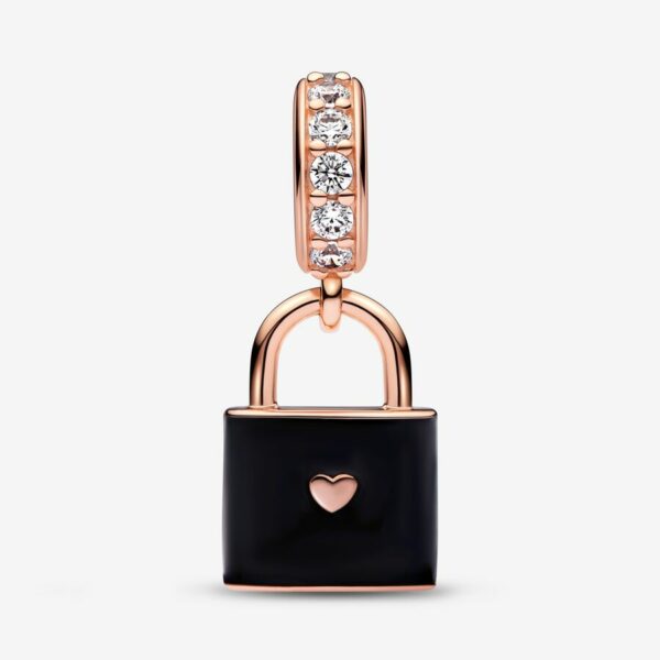 Celebrate your everlasting love with our Love Padlock Dangle Charm. This 14k rose gold-plated padlock is hand-finished with black enamel, accentuating the polished lifted script across the front and heart on the back. The script reads “Love” with a clear cubic zirconia set in the ‘o’ to match the sparkling pavé bail. The bottom of the padlock features the engraving “Precious to me”. Please note: the padlock cannot be opened, symbolising the strong bond of love.
