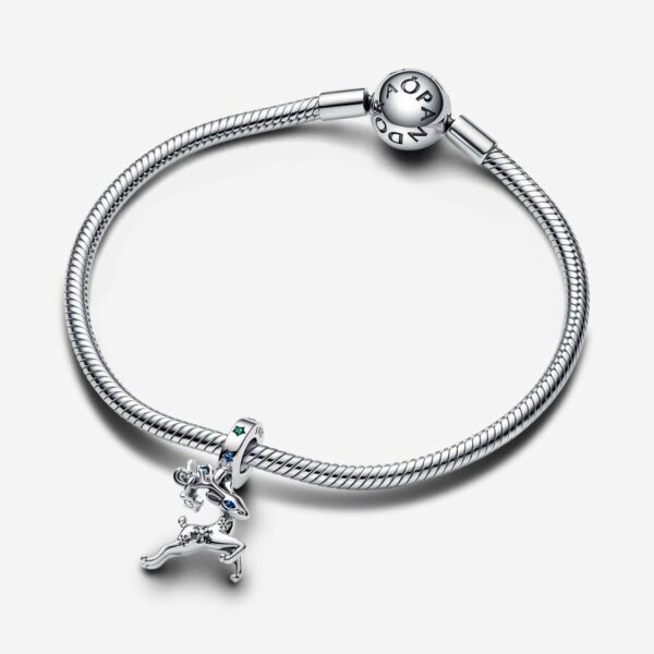 Feel the holiday magic with the Magical Christmas Reindeer Dangle Charm. This sterling silver charm features an elegant reindeer in a dashing pose, as if it’s flying through the air leading Santa’s sleigh. Engraved and imprinted snowflakes create a wintry feel and blue man-made crystals bring the reindeer’s eyes and antlers to life. The engraving “Magic is in the air” adorns one side of the reindeer’s body, while colorful man-made crystals set in star shapes bring a festive touch to the bail. A magical gift to celebrate the joy of the season.