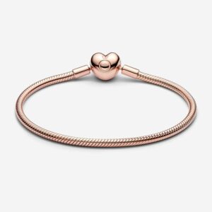 Make your story shine with the Moments Heart Clasp Snake Chain Bracelet. Our iconic snake chain bracelet gets a gleaming update in 14k rose gold plating, with a polished heart-shaped clasp. The clasp includes an engraved logo on one side and the Crown O logo on the other. Style this snake chain bracelet with up to 16 to 18 charms for an iconic everyday look that is all yours.Compatible WithMomentsColourNo colorProduct TypeBraceletsItem583050C00Metal14k Rose gold-plated unique metal blendMaterialNo Other MaterialDimensionsDepth:8.6 mmHeight:11 mmWidth:11.8 mm