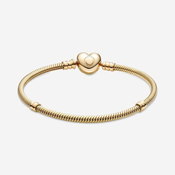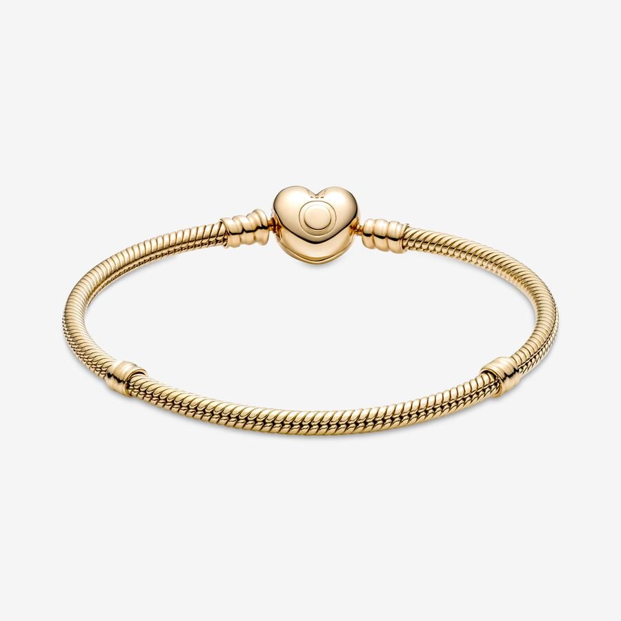 Take pride in your style with the Pandora Moments Heart Clasp Snake Chain Bracelet. Hand-finished in 14k gold, this design includes a heart-shaped clasp. Featuring our iconic snake chain, the bracelet has threaders and stoppers to keep your favorite charms in place. Wear this style on its own as a statement piece or team with contrasting chain link bracelets for a multilayered look with added texture.