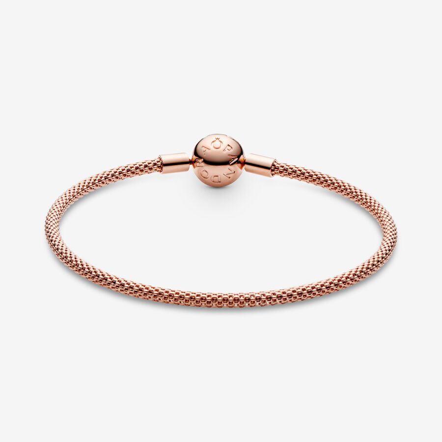 Start your next charm collection with this stylish Pandora Moments Mesh Bracelet with a textured finish. The 14k rose gold-plated bracelet’s woven mesh is perfect for adding contrast to layered looks and makes for effortless everyday styling. Wear yours solo or stack with other charm bracelets, adding favourite charms to suit your mood.