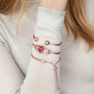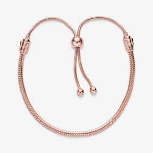 This stunning Pandora Moments Snake Chain Slider Bracelet is a sophisticated spin on the classic friendship bracelet. Hand-finished and 14k rose gold-plated – it features interchangeable end caps set with shimmering stones and an innovative sliding clasp that makes it easy to adjust. The perfect present for friends and loved ones, it can be worn as it is or filled with your favourite Pandora charms. The lobster clasp and jump ring are made from sterling silver plated with 14k rose gold.