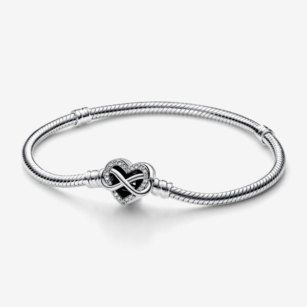 Representing the eternal love that binds family together, the Pandora Moments Sparkling Infinity Heart Clasp Snake Chain Bracelet is a meaningful gift for the ones that matter most to you. The openwork heart clasp features stones along the edge and an asymmetrical infinity symbol entwining around the heart. The back of the clasp is engraved with the message “Family forever and Always”. The bracelet features two threaders (raised charm dividers) dividing it into three sections. Style it with up to 16-18 of your favorite charms or dangle charms to symbolize the ones you love, or gift it to someone close to your heart.
