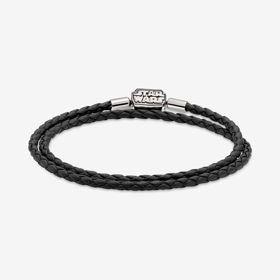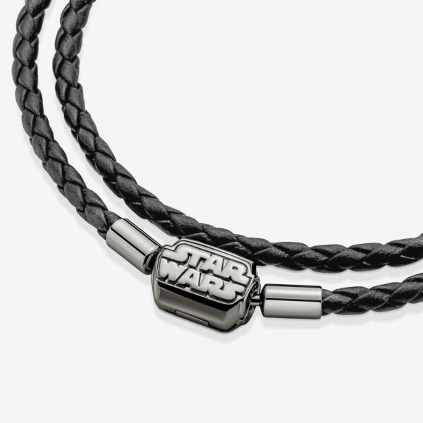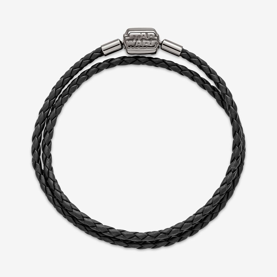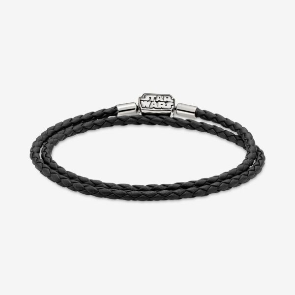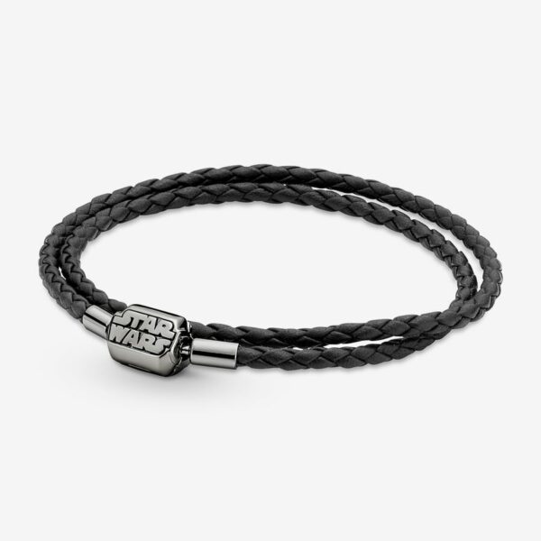 Forge your own path when you wear this Moments Star Wars™ Clasp Double Black Leather Bracelet. Inspired by the Star Wars™ films, the double wrap braided leather bracelet features a barrel shaped, ruthenium-plated Star Wars™ logo clasp. This piece can be combined with up to 14-18 charms and dangles. Wear it alone or add all your favorite Star Wars charms, bringing the power of the galaxy to your style. Note: this item is only available until 11/21/2021 or while supplies last.