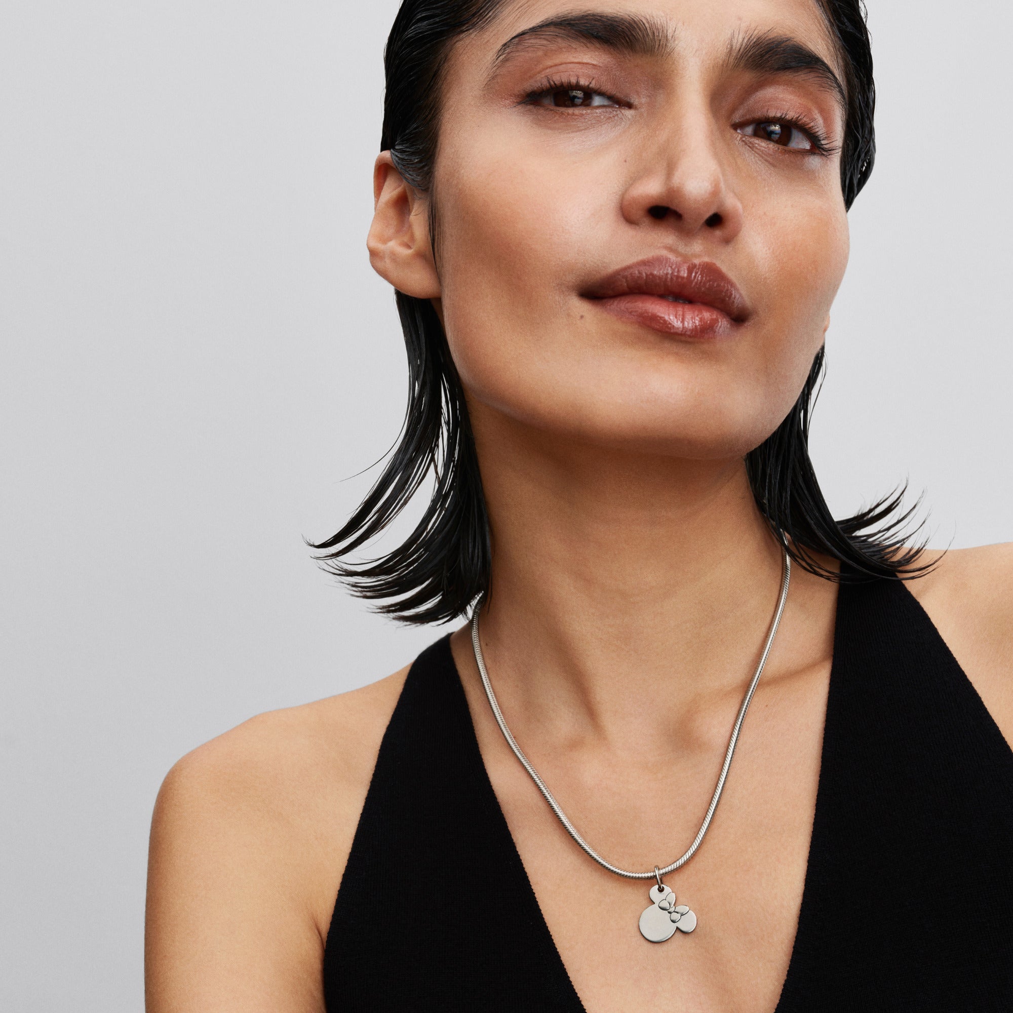 Introducing the first-ever engravable Disney x Pandora pendant, featuring Minnie Mouse’s iconic silhouette in sterling silver.