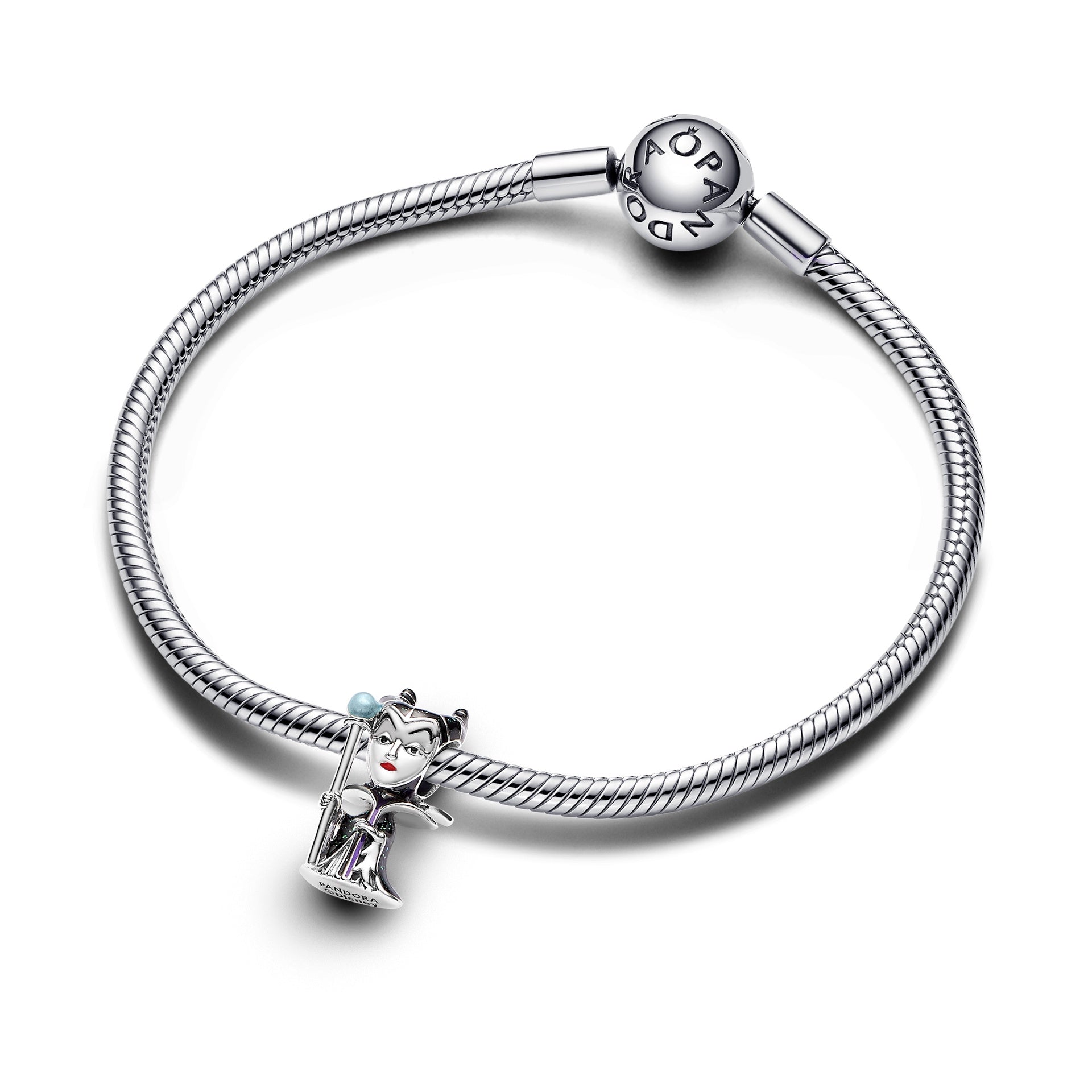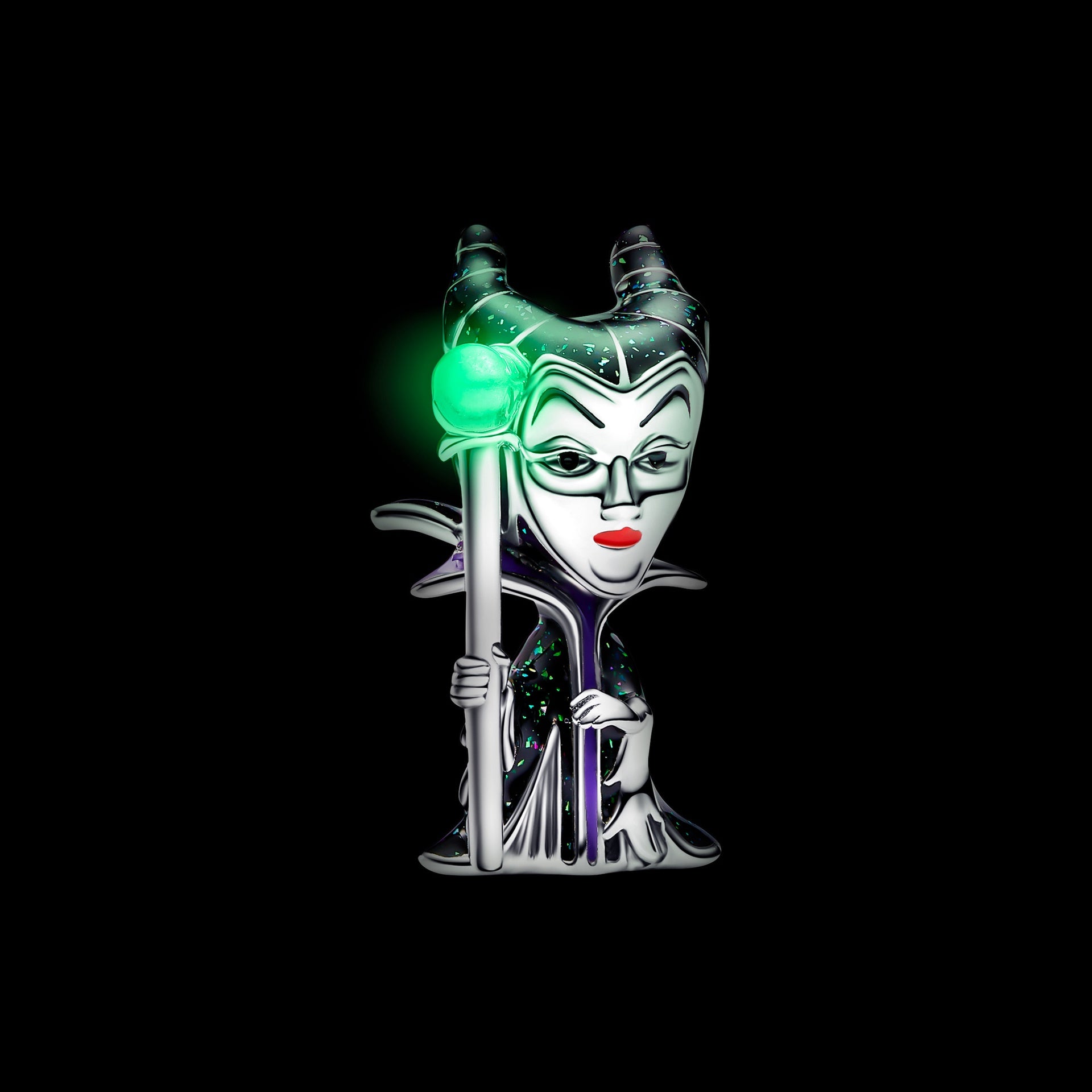 Fall under the spell of Disney’s Maleficent. A complex blend of darkness, vulnerability and strength, Maleficent rules over her domain with dark magic. Our new charm depicts her in sterling silver with hand-applied enamel on her cape and glow-in-the-dark sceptre. Embrace the shadows with pieces inspired by your favorite Disney Villains.