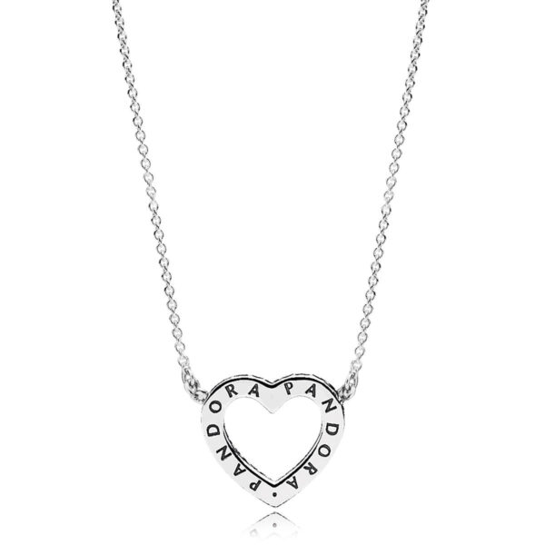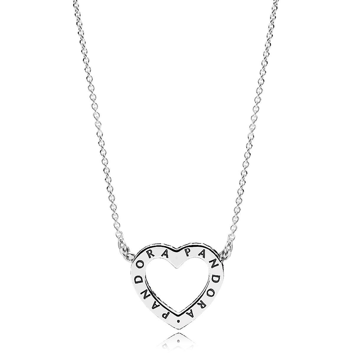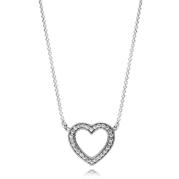 Timeless and elegant, this delicate sterling silver Valentine’s necklace takes the form of a pretty heart-shaped pendant decorated with a bridge of cut-out hearts. The versatile piece is decorated with shimmering cubic zirconia stones on one side while the other features the classic PANDORA logo.