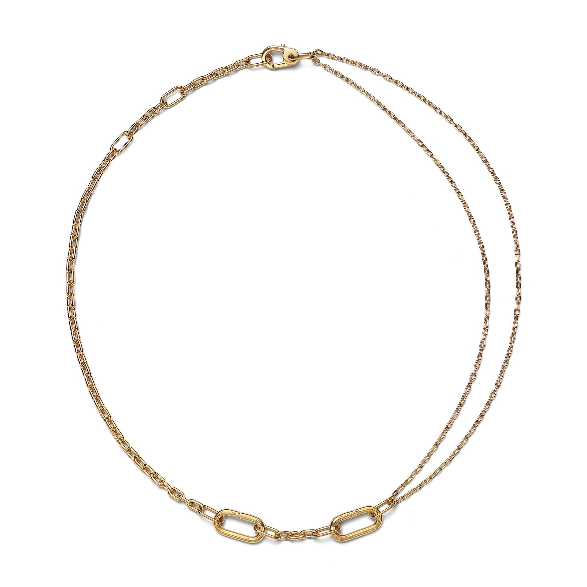 Your self-expression journey starts here: this 14k gold-plated Pandora ME Double Link Chain Necklace has endless styling possibilities to choose from, featuring two openable styling connectors – designed with grooved lines to set them apart – five links between each styling connector and a small carabiner clasp closure. Half of the necklace links up to a double chain detail, adding an individual edge to the chain. You can keep the original length, make your link chain longer or turn it into a choker, all by adding and taking away links to suit you. Once you’ve customized your link chain, remix it with meaningful medallions and mini dangles on the openable styling connectors to tell your story.