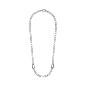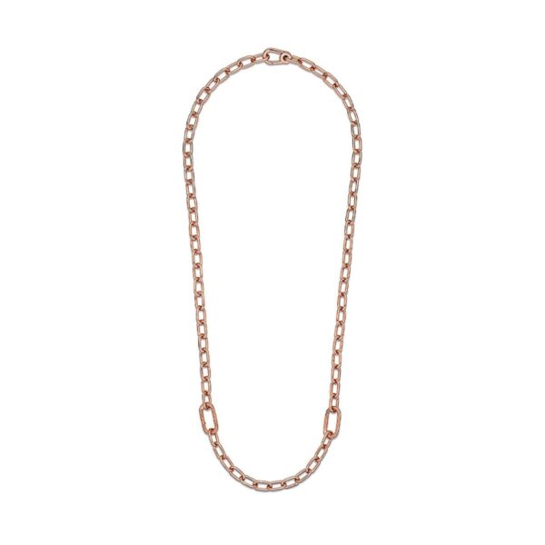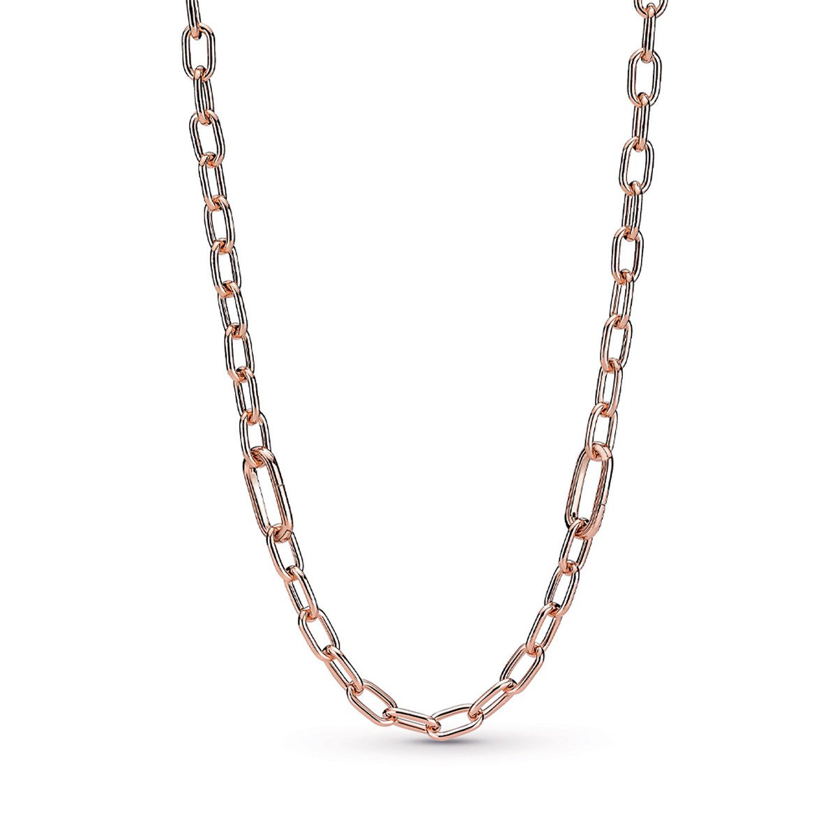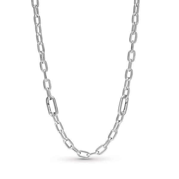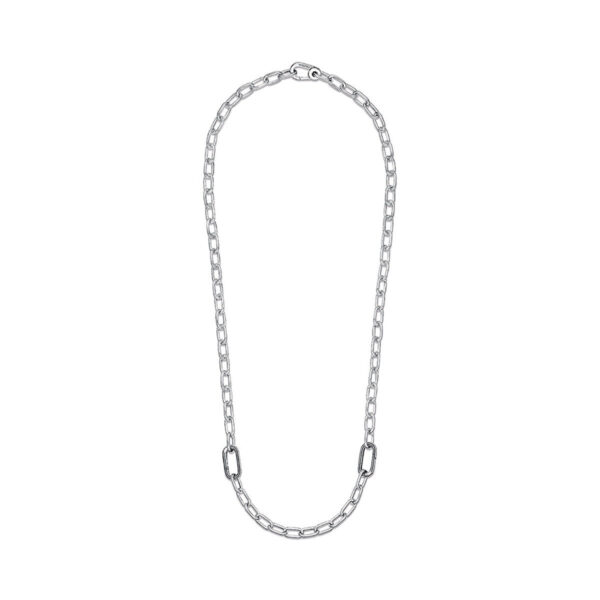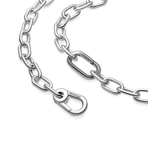 Your statement jewelry starts here: this Pandora ME Link Chain Necklace has endless styling possibilities to choose from, with two openable styling connectors at the front – designed with grooved surfaces to set them apart – twelve links between each styling connector and a small carabiner clasp closure.
