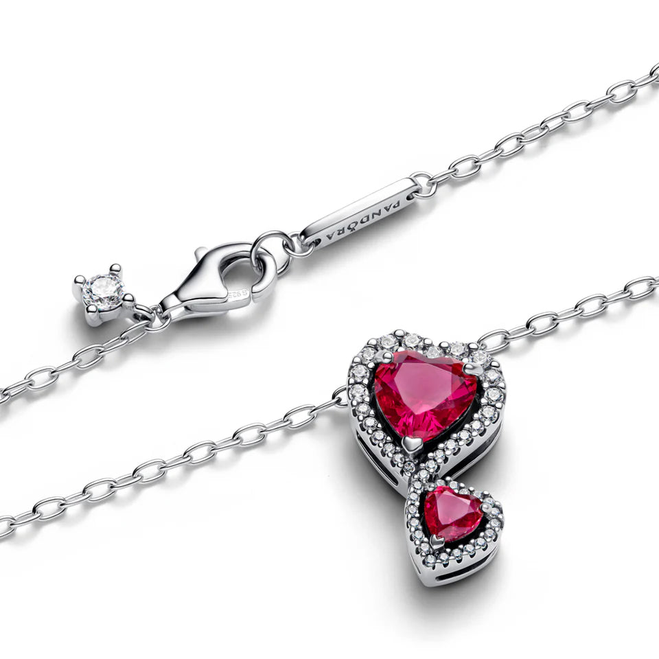 Wear a symbol of connection with the Red Halo Hearts Pendant Necklace, crafted in sterling silver. This sparkling piece features two prong-set heart-cut red man-made crystals, beautifully accented by a halo of pavé stones. The adjustable 60 cm cable chain allows you to style it at 55 cm or 50 cm, perfect for layering. Wear it to celebrate the deep connection of love.