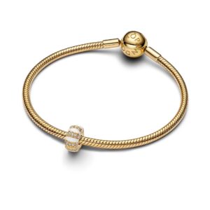 Your look will shine with the warm-toned Stones & Enamel Clip Charm. This 14k gold-plated charm features alternating rows of sparkling stones and shimmering white enamel, which contrast intriguingly with the charm’s gold-plated base, which also has a silicone grip inside the clip. The charm’s design was inspired by motifs of resilience and beauty – symbolising the many possibilities you hold within you, much like the possibilities held within one small yet elegant and thoughtfully-made piece.