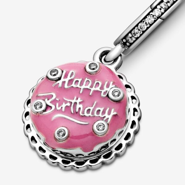 Say “Happy Birthday” with this sterling silver Pink Birthday Cake Dangle Charm. Celebrate the special day with a cake charm that will keep you in festive spirits all year round. The dangle features a hand-applied pink enamel design and clear cubic zirconia dotted around representing candles. The raised “Happy Birthday” script on the front dangle is joined by a candle symbol engraving and the message “Make a wish!” on the back. Make any birthday one to remember with this celebratory charm.
