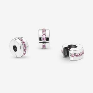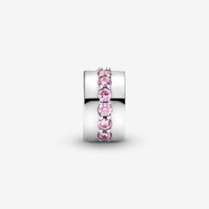 Our clip charms create balance on Pandora Moments bracelets, evenly spacing your adornments as well as adding decorative finish. This polished sterling silver design is carefully detailed by hand with a row of pink cubic zirconia, perfect for adding a splash of pink to your look. Mix and match with other favorites from the collection. This clip charm features no silicone grip, so it will slide if not styled onto threads (two raised charm dividers).