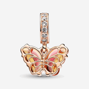 Transform into your best self with the Pink & Yellow Murano Glass Butterfly Dangle Charm. This 14k rose gold-plated charm features Murano glass wings in an orange-and-pink gradient with a cut-out pattern on the back that shows through the glass, and 14k rose gold swirls on the front. Microbeads on the butterfly’s body and pavé on the bail add a touch of delicate sparkle. Add this bright butterfly to your look as a powerful symbol of transformation and new beginnings.