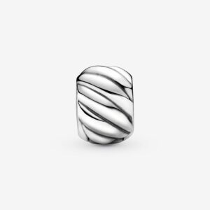 Add subtle texture to your Pandora Moments bracelet with this sterling silver clip charm, decorated with curved lines that resemble the delicate structure of feathers. Polished to a high shine, the minimalist Pandora clip is ideal for keeping the charms on your bracelet safe and preventing them from sliding freely. Wear it with other sterling silver charms or style with contrasting metals to channel the feeling of freedom the feather represents. This clip charm features no silicone grip, so it will slide if not styled onto threads (two raised charm dividers).