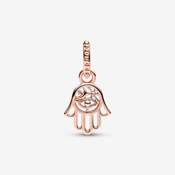 Always channel positive vibes with the Protective Hamsa Hand Dangle Charm. This Hamsa charm features an intricate openwork design in 14k rose gold plating and hangs from a beaded bail. An eye, rays and crescent moon motifs feature inside the hand, which includes one-sided beading along its outline. Traditionally worn as a talisman to defend against evil, the dangling hand is seen as a gesture of welcoming kindness, friendship and grace into your life.