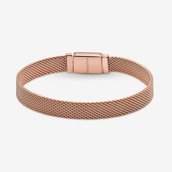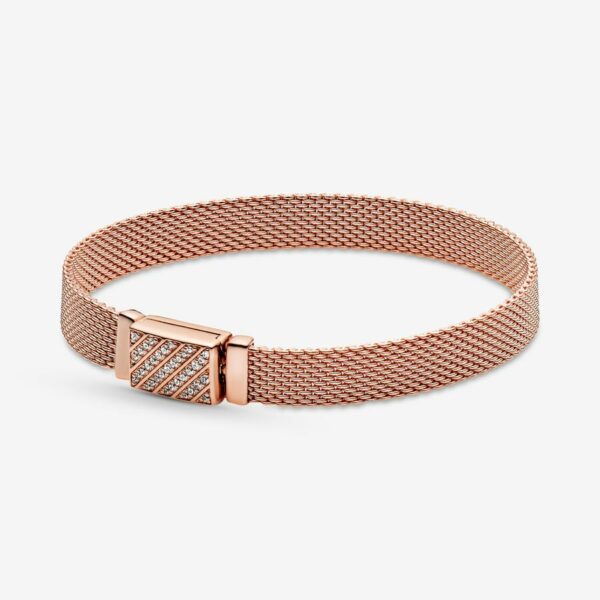Add some sparkle to your look with the Pandora Reflexions Long Clasp Pavé Bracelet. Featuring an elongated clasp shape with diagonal rows of clear cubic zirconia pavé on the front and a polished back with Pandora logo, this 14k rose gold-plated fine flat mesh bracelet is hand-finished. Designed in the modern minimalist aesthetic of Pandora Reflexions, this warm-toned bracelet is a sleek, stunning and sophisticated addition to any look.
