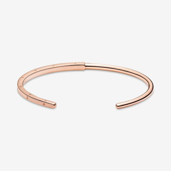 Streamline your look with the Pandora Signature I-D Bangle. With a half-squared, half-rounded profile, this 14k rose gold-plated bangle is hand-finished. The round polished profile transitions to a larger squared profile in the middle, which features the Pandora logo on its three outer sides. Each end of the bangle includes the Pandora Crown O monogram. The bangle is precisely sized for optimal performance and fit and is not designed to be flexed and twisted when put on and removed.