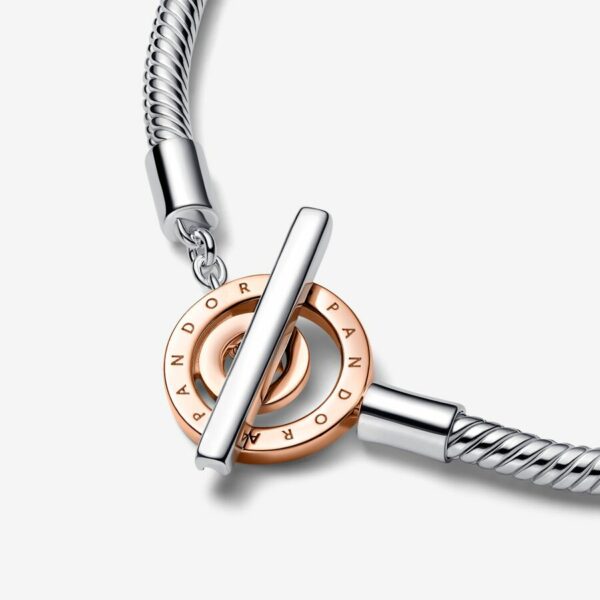 Make a statement with this bold and graphic piece. Inspired by our iconic pendant design, the Pandora Signature Two-tone Logo T-Bar Snake Chain Bracelet features a duo of 14k rose-gold plated circles forming a closure that can spin a full 360 degrees. A sterling silver T-bar attaches to the inner circle to secure the clasp. Add up to 18 of your favorite charms, dangles or pendants and tell your story with your signature style.