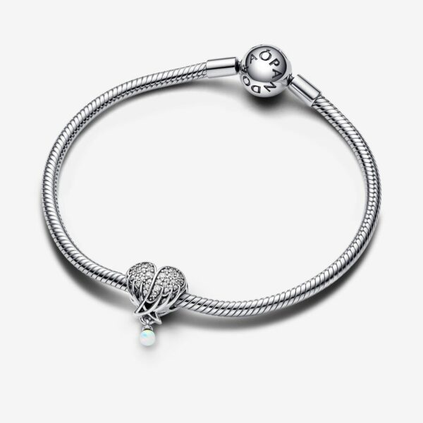Honor your angels with the Sparkling Angel Wings & Heart Charm. Designed to uplift and inspire, this sparkling addition to the Pandora Moments collection is set with 68 round brilliant-cut clear cubic zirconia stones. A memorable addition to your sterling silver charms, this charm is made even more special with a white lab-created opal dangling from the heart-shaped set of wings. A touching tribute to all the angels who watch over us.