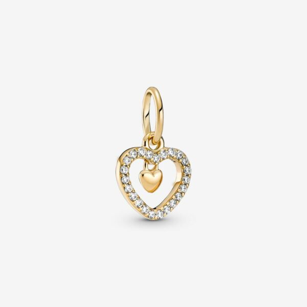 Always shine bright with the Sparkling Double Heart Dangle Charm. Hand-finished in 14k gold, this design features a heart-shaped frame set with sparkling stones, with a small polished heart detail dangling in the center. Style this piece with other 14k gold charms for a glowing look or team with sterling silver designs to allow the heart-shaped motif to stand out. Alternatively, gift this style to someone close to you as a token of your love.
