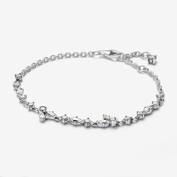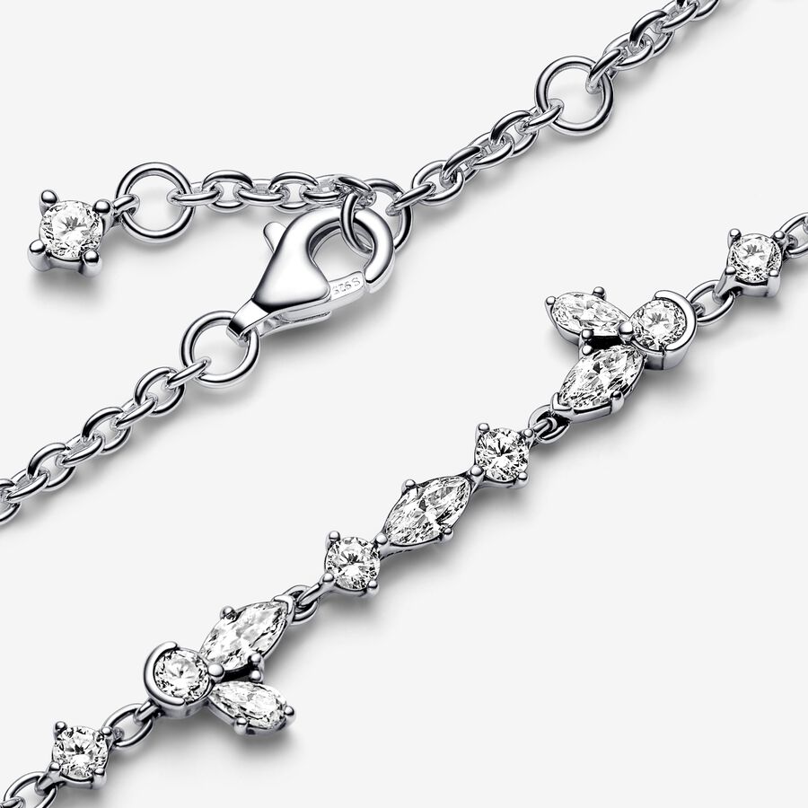 Take inspiration from the beautiful shapes of nature with the Sparkling Herbarium Cluster Chain Bracelet. Inspired by pressed flowers and leaves, this hand-finished sterling silver bracelet is set with cubic zirconia stones in alternating round and marquise shapes along half the chain, with two clusters of round, marquise and pear-shaped stones creating nature-inspired shapes, attached by jump rings so they move naturally with the chain. The bracelet is adjustable to three sizes. Elevate your looks with this elegant reminder of the beauty of nature.