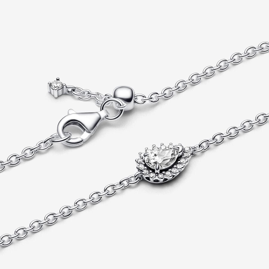Shine brighter than ever when you wear the Sparkling Pear Halo Chain Bracelet. This bracelet features a striking pear-shaped stone raised slightly above a delicate pavé halo. A V-shaped prong and two round prongs hold the center stone in place, while a clasp with an adjustable silicone ball keeps your bracelet secure. A small stone dangles from one end of the chain. A reimagined classic with ample sparkle and dimension, this sterling silver chain bracelet makes a stunning statement and a perfect gift.StoneCubic ZirconiaColourNo colorProduct TypeBraceletsItem593001C01MetalSterling silverMaterialNo Other MaterialDimensionsDepth:3.5 mmHeight:7.3 mmWidth:9.9 mm