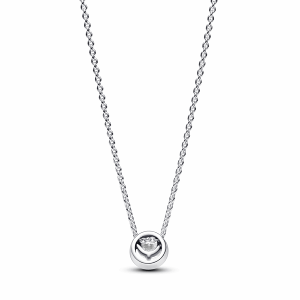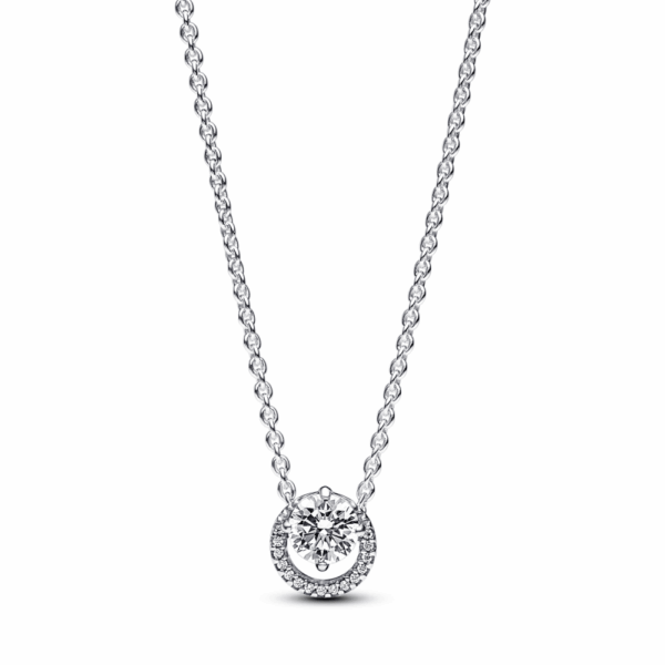 Channelling timeless elegance, the sterling silver Sparkling Round Halo Pendant Collier Necklace, adorned with clear cubic zirconia, represents the enduring beauty of circles. The pendant features an off-centre, prong-set round stone that delicately overlaps a pavé halo, allowing it to slide freely along the adjustable 38 cm, 42 cm, or 45 cm cable chain. With an engraved Pandora logo and a dangling stone by the lobster clasp, this necklace adds sophistication to any look. A perfect gift for those who appreciate classic beauty and elegance.