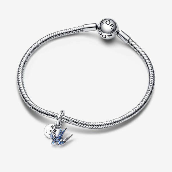 Spread your wings with our Sparkling Swallow & Quote Double Dangle Charm. Symbolizing hope for better days to come, this sterling silver piece features a swallow detailed with grooved feather lines and pavé in varying shades of blue. “Time to fly” is engraved on a round disc behind the soaring swallow. Style this double dangle charm with other swallow-inspired jewelry for a look that channels the spirit of the season.