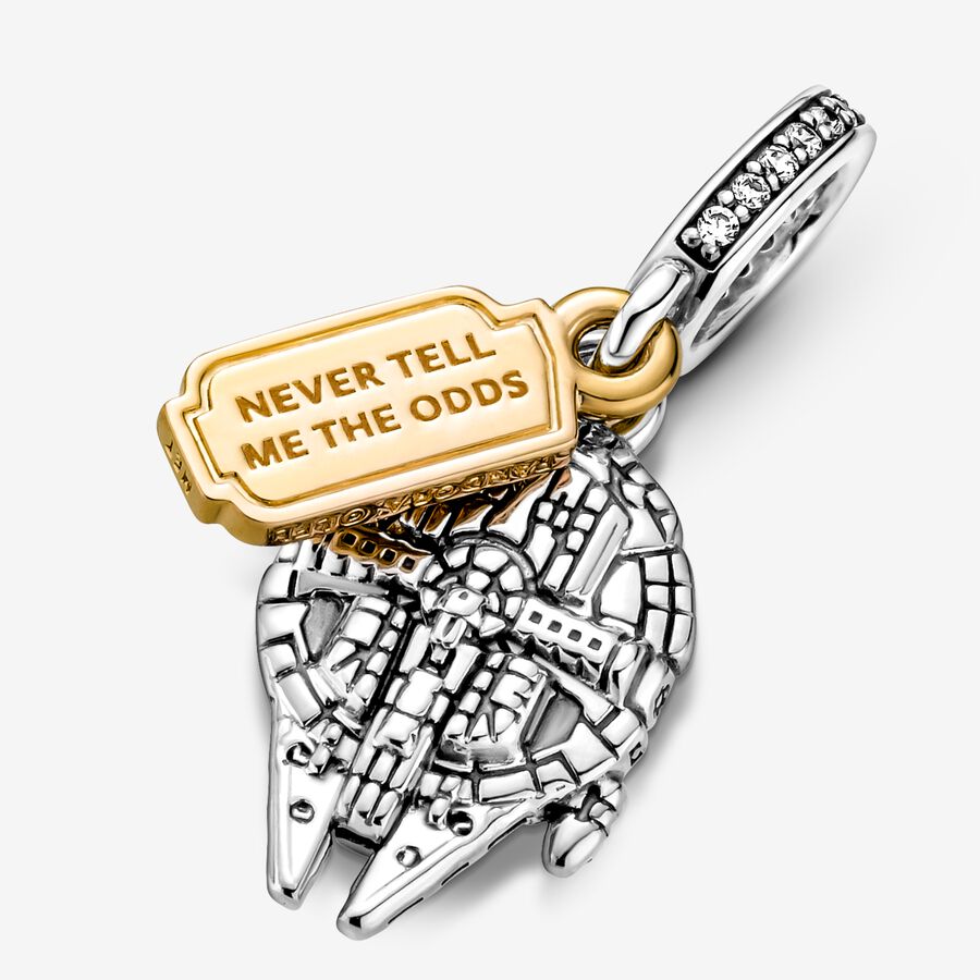 Keep the Force close with the Star Wars™ Millennium Falcon™ Dangle Charm. Hand-finished in sterling silver and 14k gold-plated metal, this two-tone Star Wars charm is full of the spirit of the galaxy. One dangle features the Millennium Falcon spaceship, including intricate technical details, while the other dangle features a tag with the Star Wars logo on one side and the engraving “Never tell me the odds” on the other side.